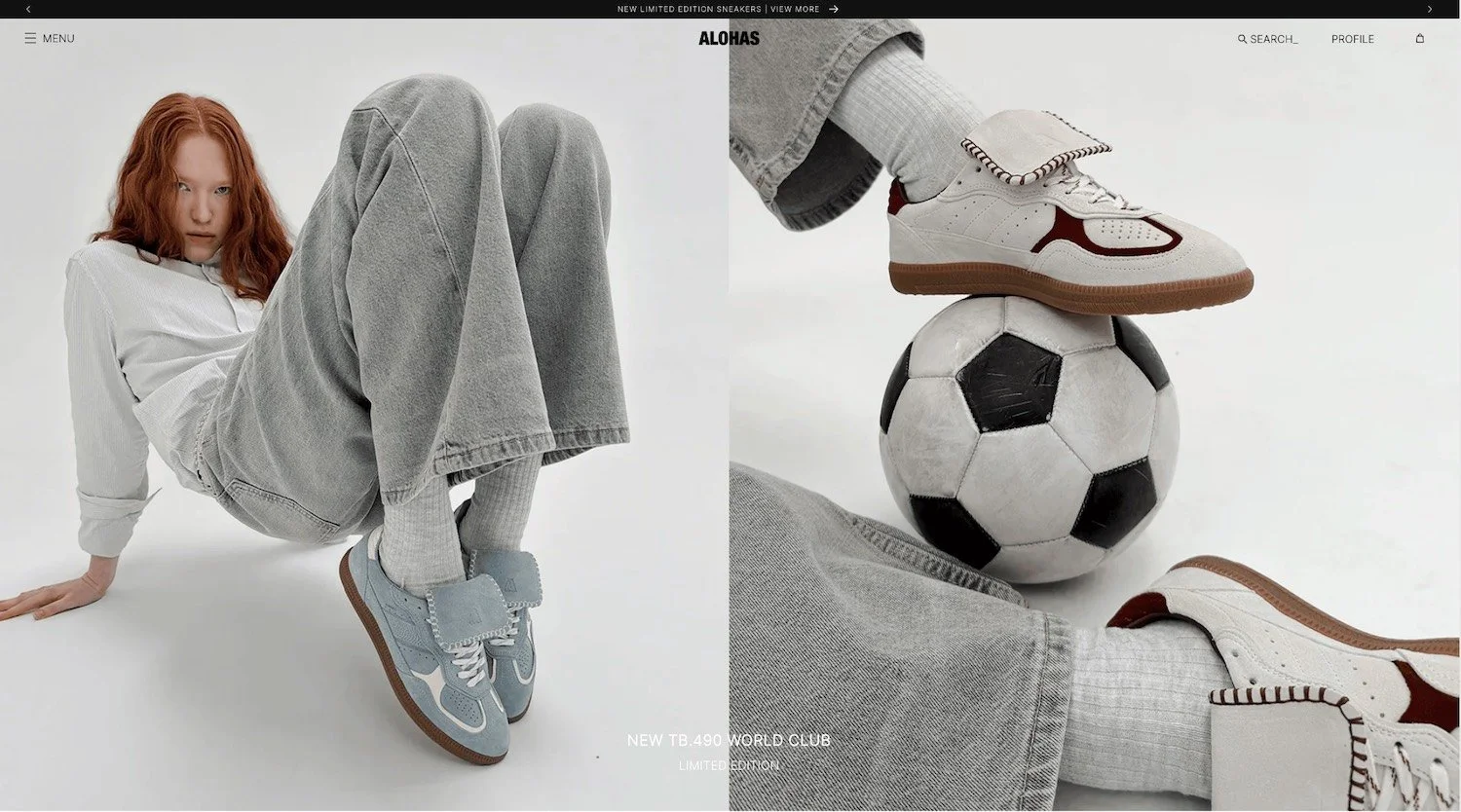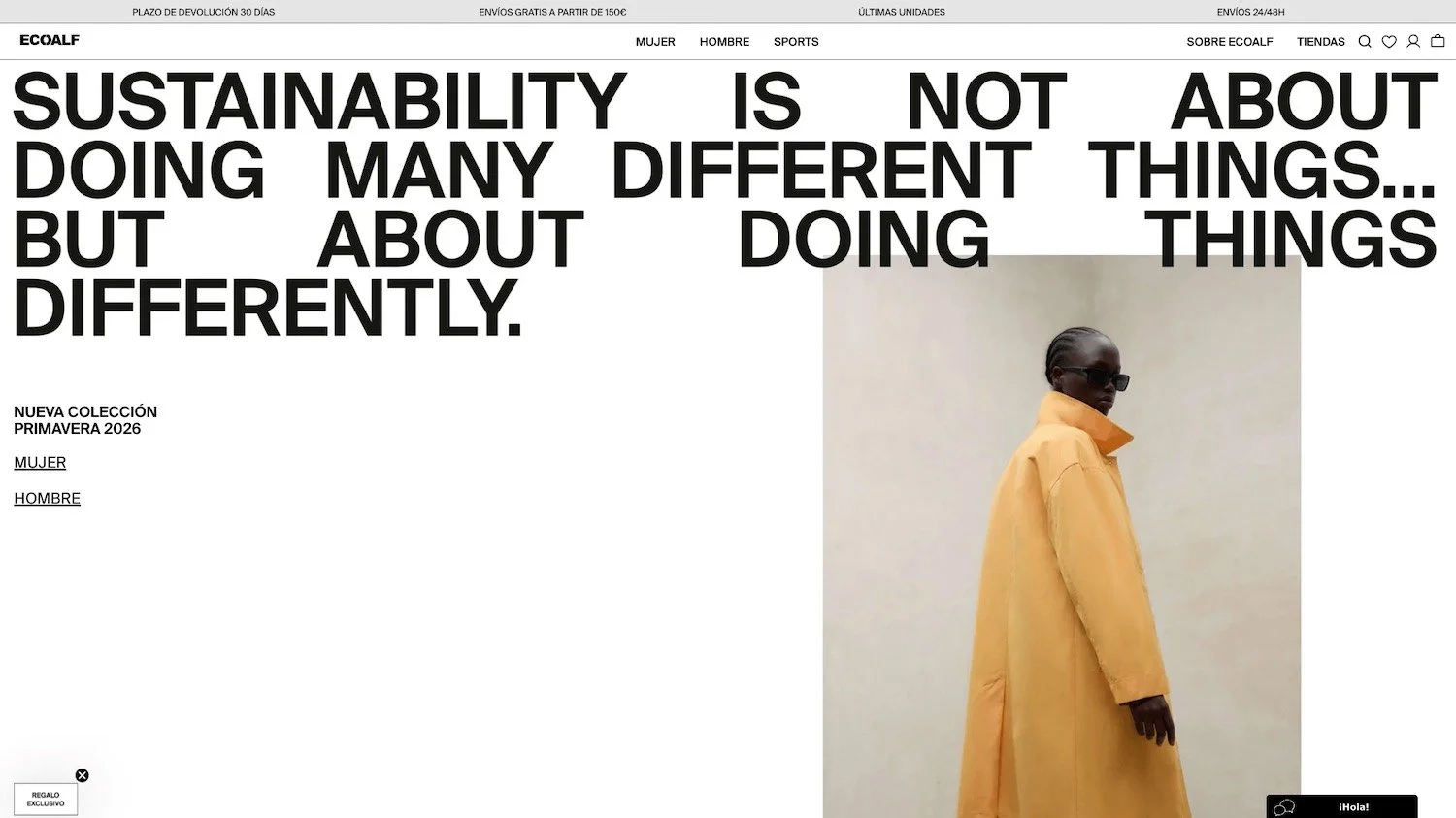 Alohas apuesta por el modelo de producción bajo demanda para minimizar el desperdicio. Y eso está en el centro de su diseño web: el modelo pre-order es el eje de la experiencia de compra, con contadores reales, fechas de entrega visibles y comunicación transparente sobre por qué funciona así. Su estética es muy premium, con fotografía editorial limpia y un uso excelente del espacio en blanco.